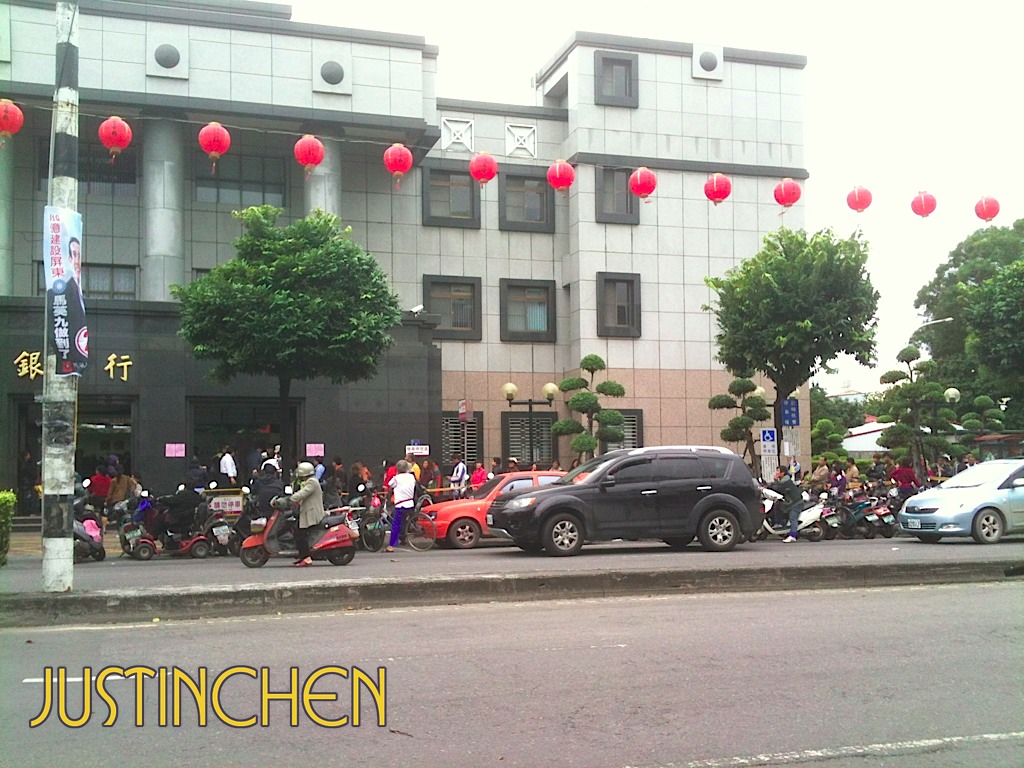 £一到台銀屏東分行就看到擁擠的人潮,沿著人龍一直騎,直到尾端我就把機車停好開始排隊。這裡是第二個轉彎點的尾端了,表示隊伍再彎過去到底就是一整個完整的block了。
