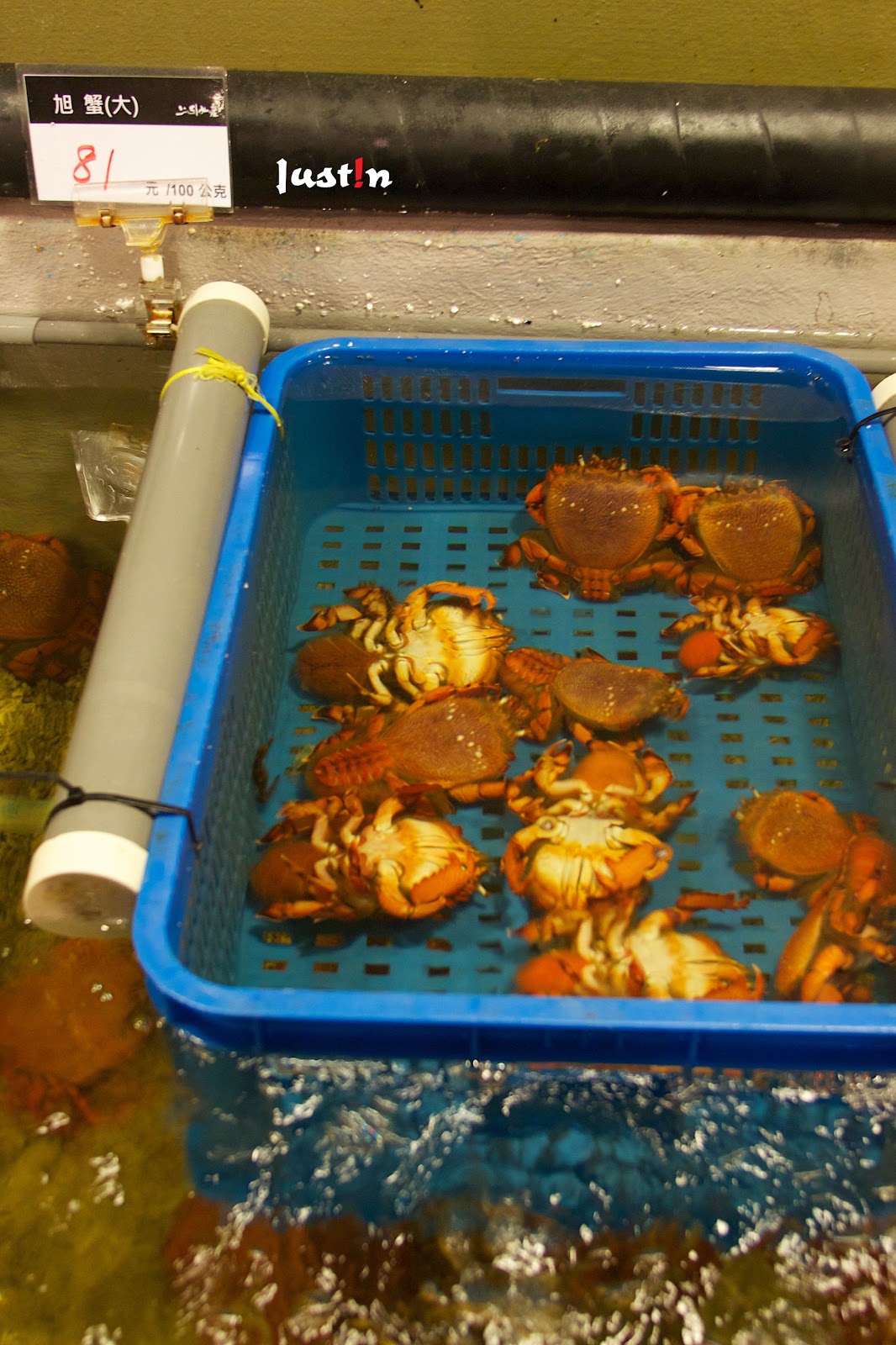 ▼一進到館內就會先看到水池區域,這裡有許多活生生的海洋生物,或許該說是新鮮食材但好像有點殘忍。以甲殼類的蝦、蟹為主,種類算還好,但數量還挺多的。尤其一進門就是超大隻帝王蟹,看單價秤重算下來,一隻好像都可以破萬的樣子。