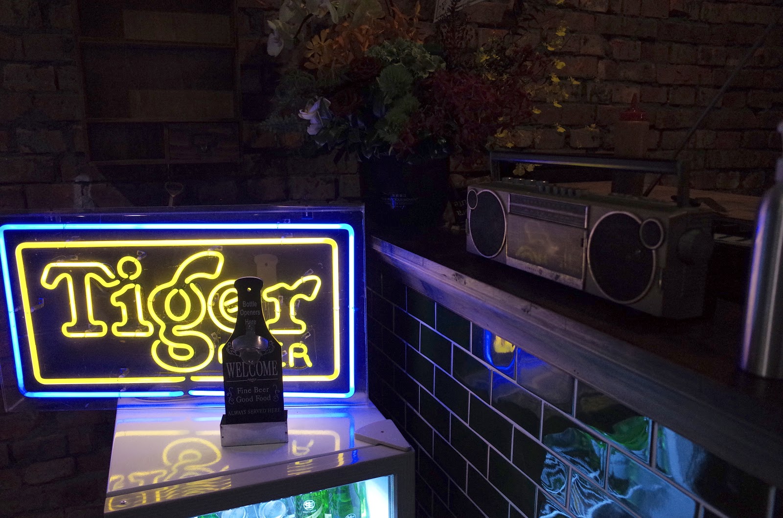 文字霓虹燈、冰箱與手提音響,很不錯的擺設。