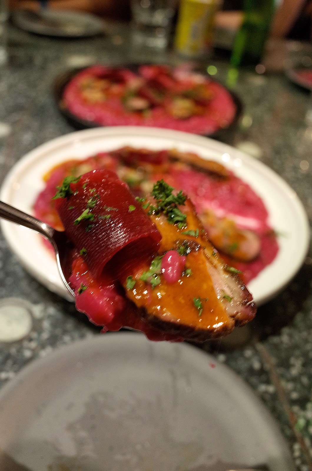 甜菜根誇張的染色,每片鴨胸煎得軟嫩,佐上一片醃漬過的甜菜根切片,好豐富的味道啊!