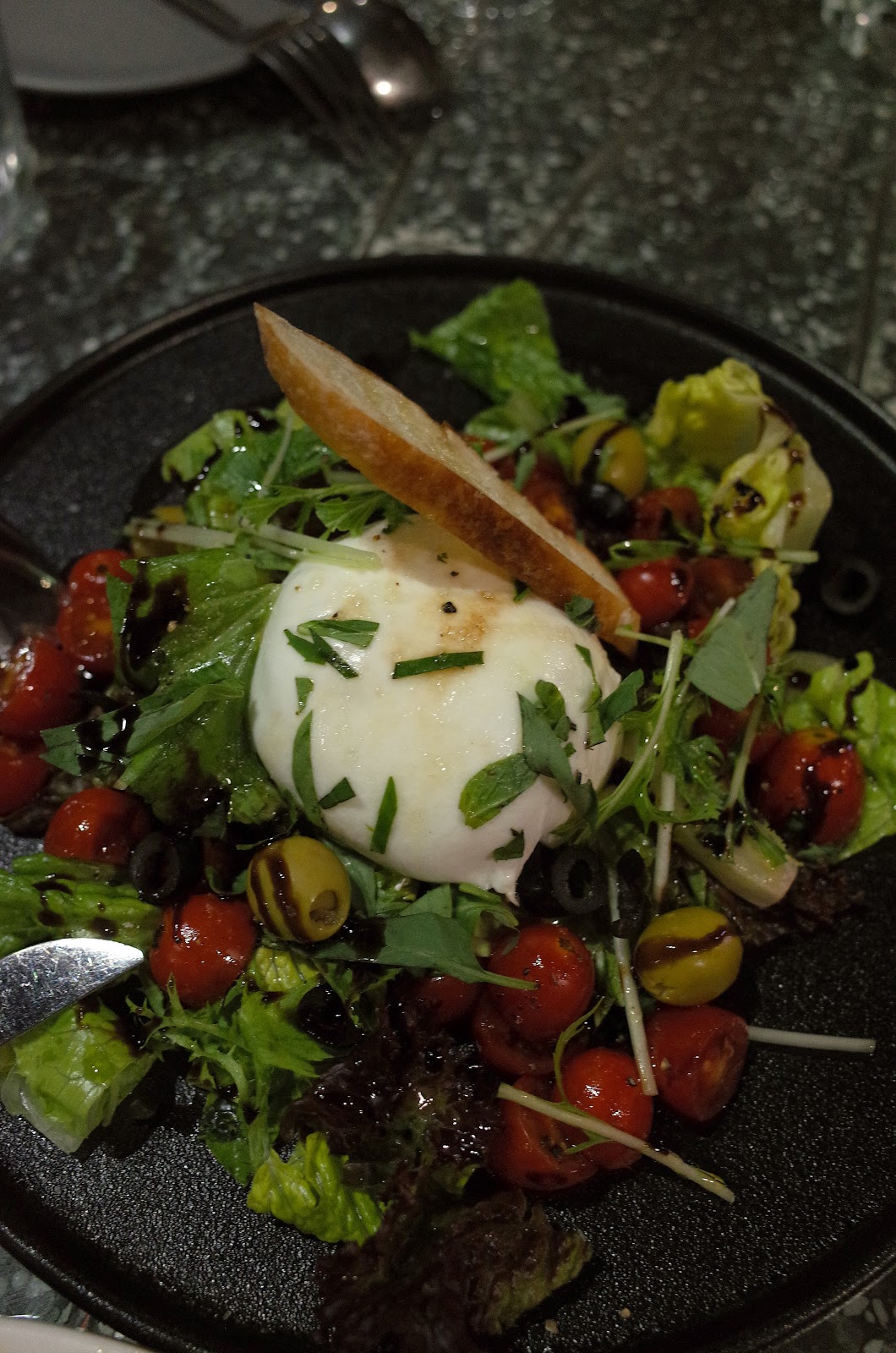 另外一份沙拉,一改義式蕃茄起司沙拉的形式,盤子上鋪滿小番茄、醃漬橄欖與生菜,整顆莫札瑞拉起司就放在上面,自己挖來享用。