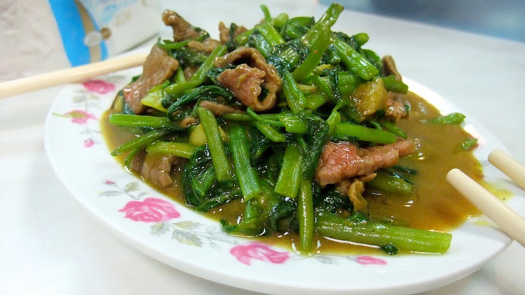 等了不久的一陣子,終於上菜了,第一道炒咖哩牛肉,一上菜整個要樂昏了,開心在撲鼻而來的香味,雖然是咖哩但不會像真的咖哩飯那樣誇張的整個都是咖哩醬汁,大概就是用咖哩提味一下,然後一樣是一般的空心菜炒牛肉的方式快炒,牛肉品質不用說,非常軟嫩,不會有奇怪的牛腥味。