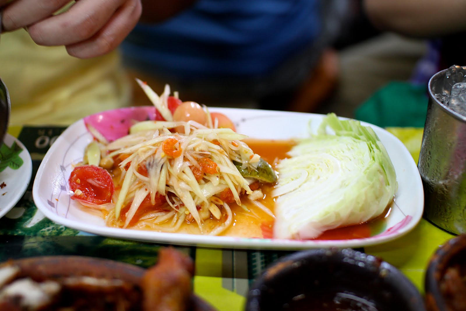 ▼每餐必備青木瓜沙拉,這是很基本的樣式,清爽夠味,一整塊的生高麗菜就這樣擺在那邊,搞得好像要吃涮涮鍋一樣。我後來真的有把那塊高麗菜吃掉,很有嚼勁,天熱沒食慾這樣吃還滿爽的。