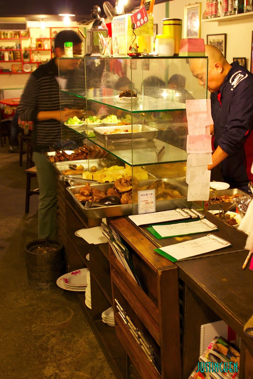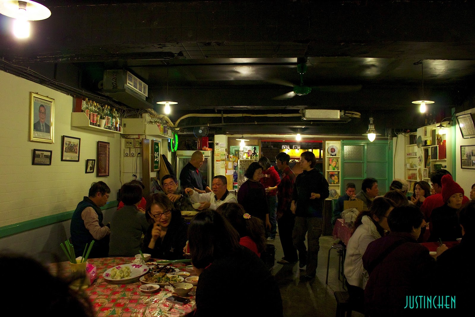 ╤店內主要是以大圓桌為主,上面也是傳統的塑膠花布,塑膠筷桶及綠色細長塑膠筷都很有復古風味。邊邊牆上有許多過去的老照片。