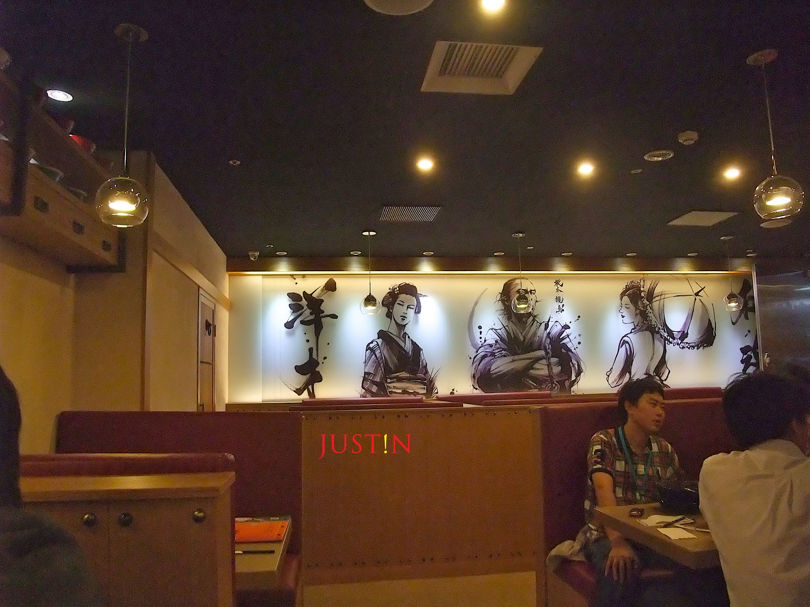 店家說:「三士」的品牌名稱是源自於日本明治維新三傑,指的是致力於推翻幕府提倡維新的三位志士-西鄉隆盛、木戶孝允及大久保利通。所以店裡的主要裝飾就是牆壁上這三士大大的墨水畫像,還是請了日本繪畫大師茂本秀吉來位店家設計作畫的。除了三位之外還有坂本龍馬,他們之間到底有什麼關係我也不清楚,對日本歷史不熟。