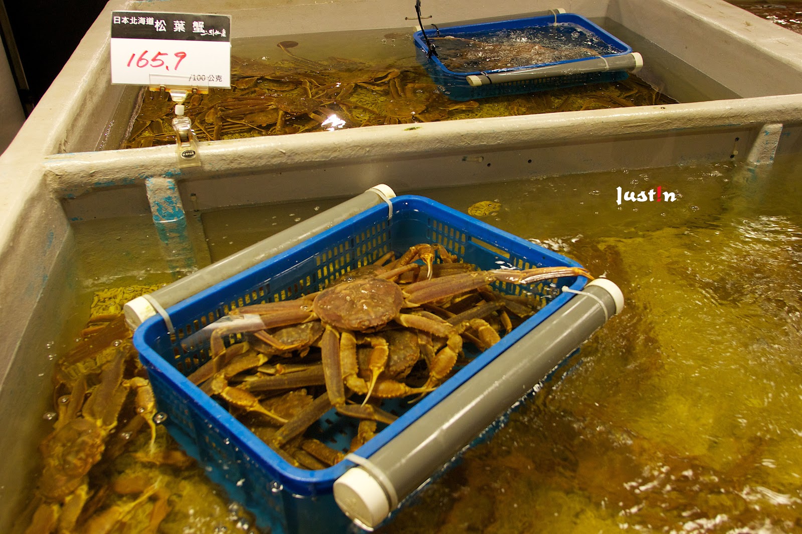 ▼一進到館內就會先看到水池區域,這裡有許多活生生的海洋生物,或許該說是新鮮食材但好像有點殘忍。以甲殼類的蝦、蟹為主,種類算還好,但數量還挺多的。尤其一進門就是超大隻帝王蟹,看單價秤重算下來,一隻好像都可以破萬的樣子。