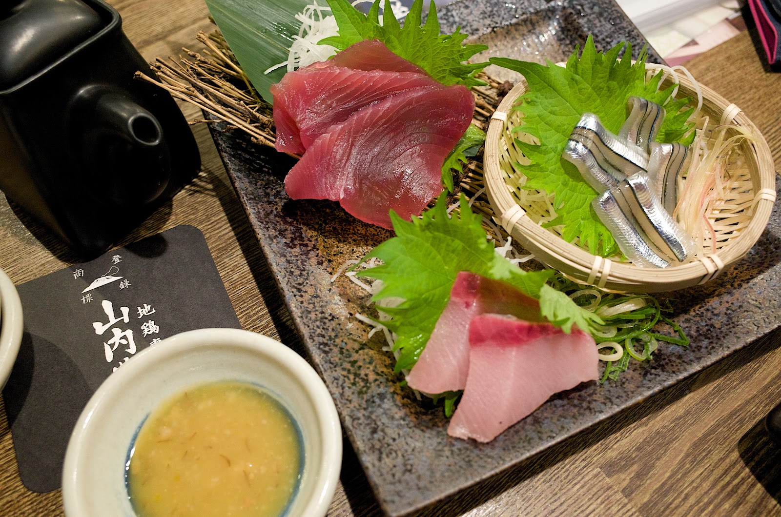 接著登場的是今日最高期待:雞肉刺身。採用國產高級雞肉,本身是低溫保存所以肉質稍微偏凍,但不致於硬梆梆。旁邊灑上大量蔥花、芝麻、洋蔥與薑末,還有酸酸的醬汁搭配實用。