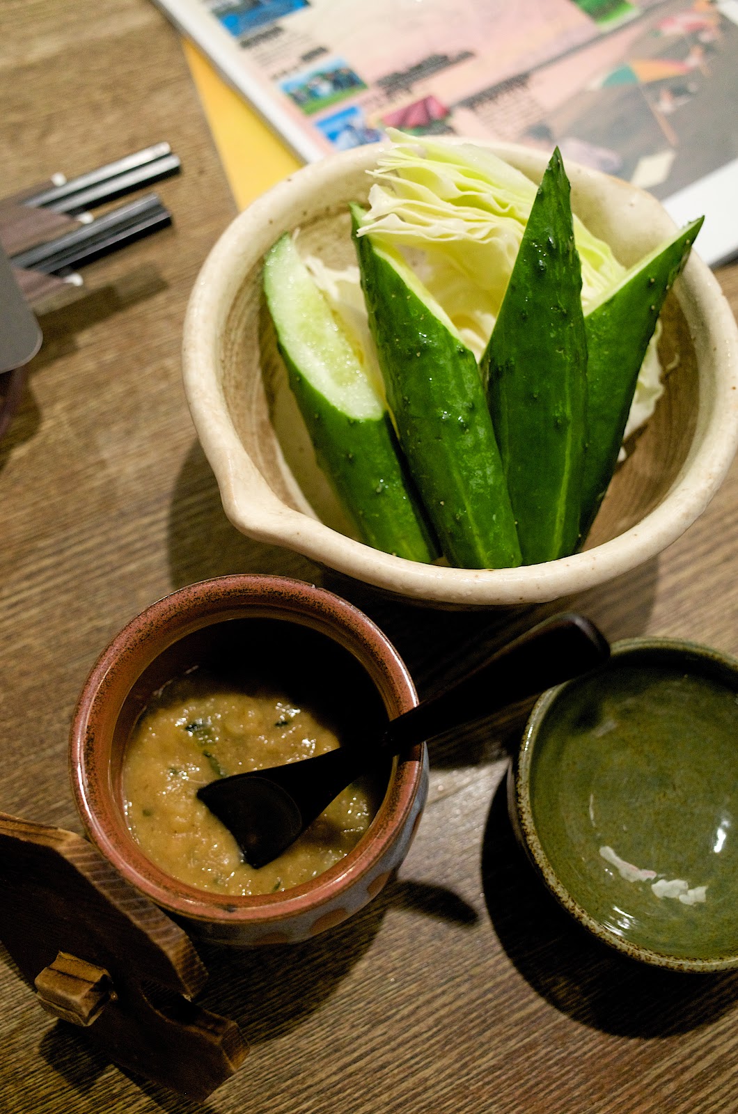 先上了生菜與味噌,我們想這可能是招待的開胃菜。這味噌真的是超級好吃的,單吃好吃,配小黃瓜更是超級美味。多想多來幾份。
