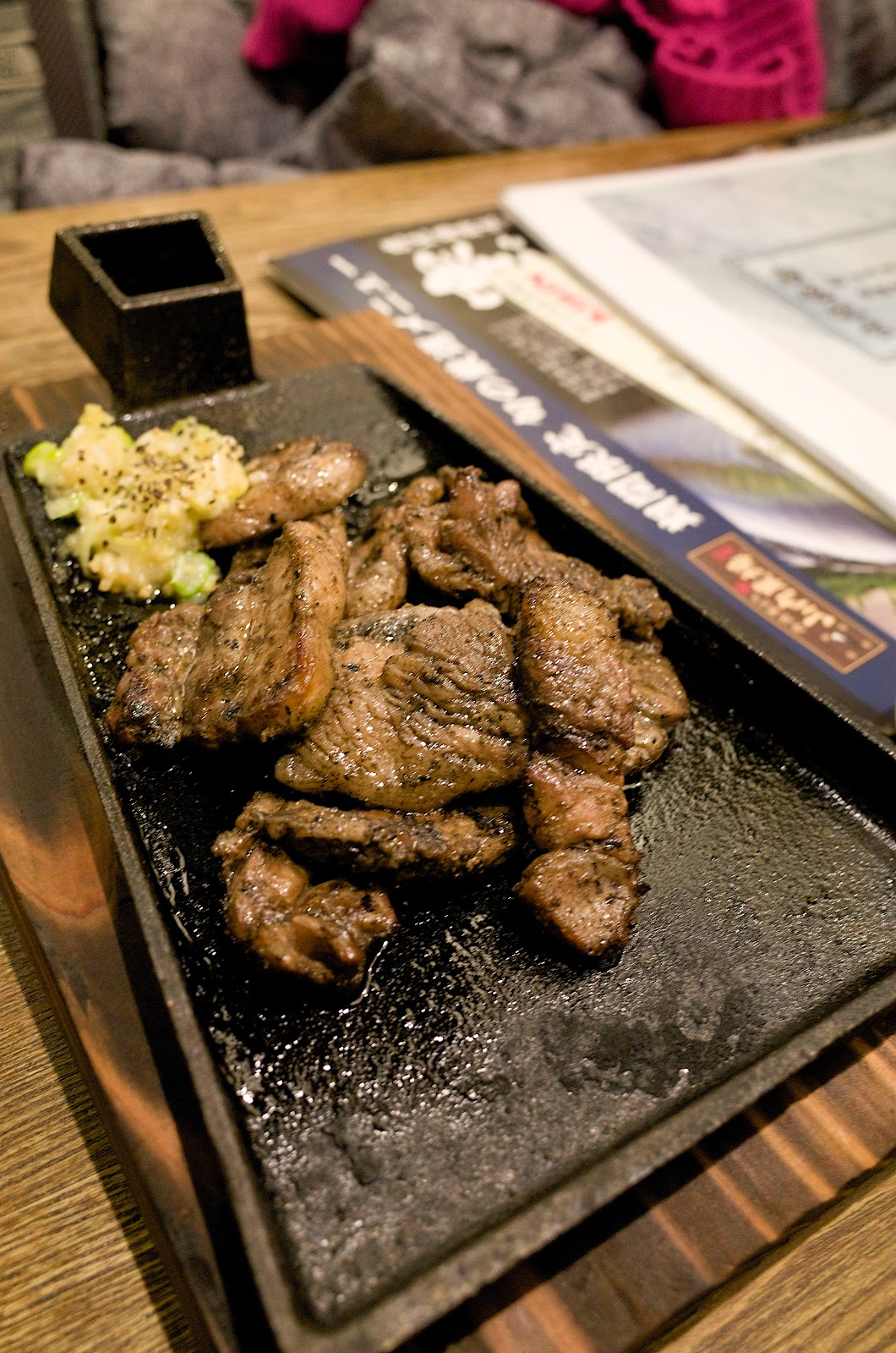 坐下之後又是一場災難,沒多久那個服務生就拿著菜單出現在我們桌前,翻開到某頁就指著幾道菜然後什麼也不說,應該就是推薦熱門菜色吧!但我注意一看完全沒有中文阿,門口都是寫假的,然後也沒有我們想吃的生雞肉。