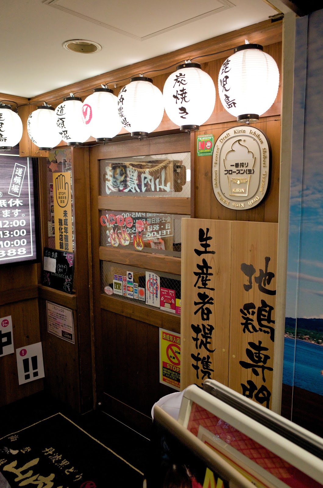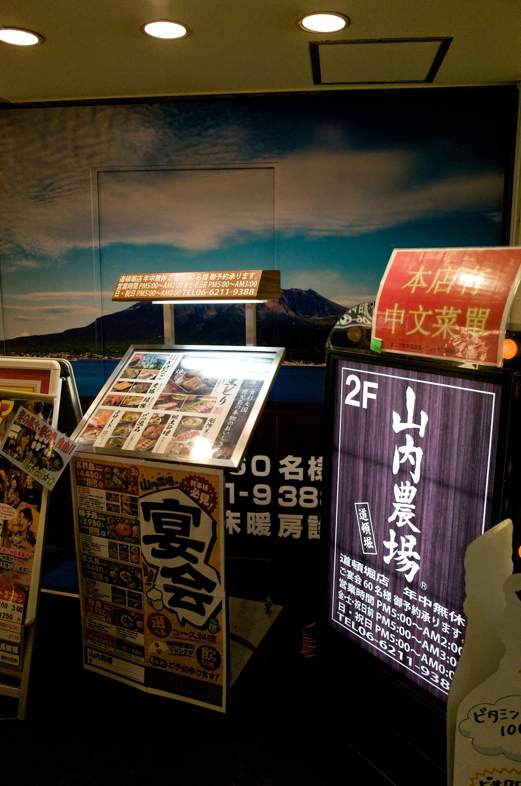 第一站就來到了觀光客必備的道頓崛商圈,正在思索該以什麼當做第一餐的時候,就想到Jacqui友人曾經推薦過的生雞肉餐廳-山內農場。於是馬上上網搜尋正確位置在哪,發現原來就在道頓崛最熱鬧的十字路口附近,但因為是在大樓的二樓,且附近有很多同樣性質的居酒屋餐廳,在找尋上還是有些微的困難度,加上門口的推銷人員過度熱情介紹,剛進大樓時實在有點擔心。