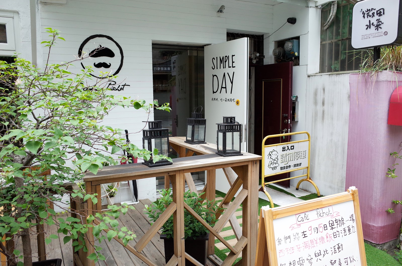 店面位在捷運南京復興站的附近巷子內,走路大概10分鐘左右。店門口有個小花園,也有一些戶外的座位,歐美民眾滿喜歡在戶外悠閒用餐的,但台灣的天氣真的只有深秋與初春的時候比較適合,空氣不會那麼黏膩,也還沒到大風大雨的日子。