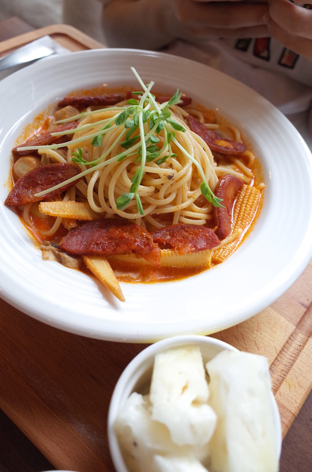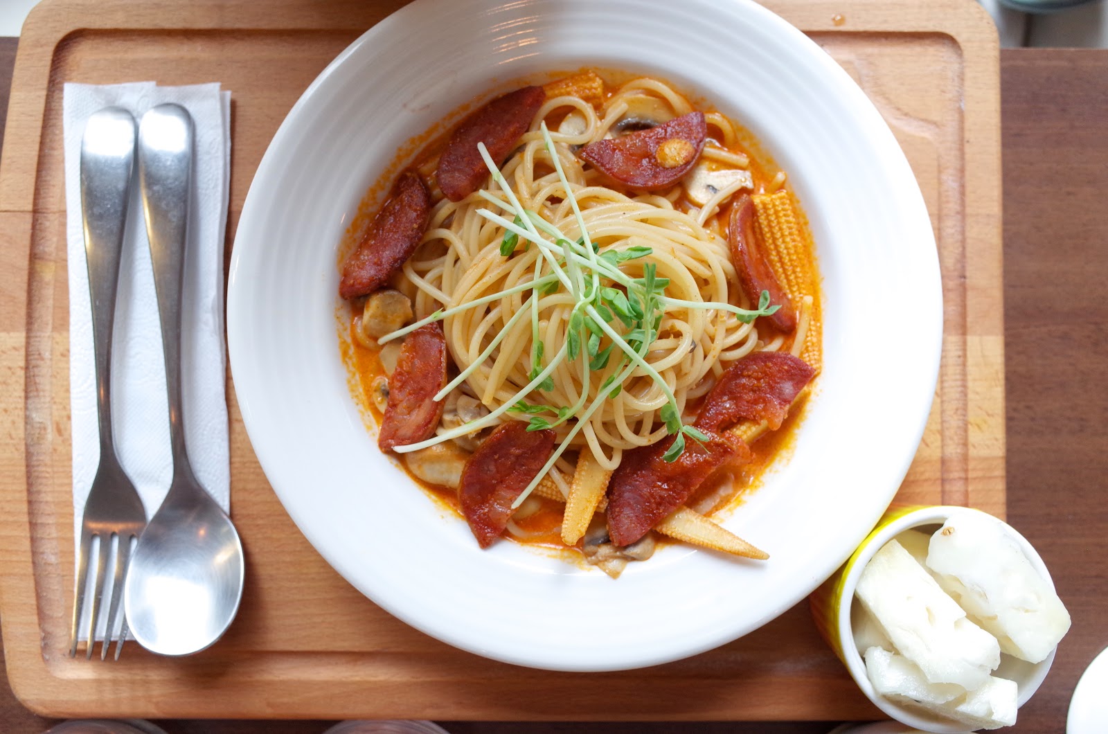 老婆點的臘腸義大利麵,正確名稱我們都忘記了,所以請多包涵我亂取俗名。香腸口味很不一般,可以說是偏西班牙的風味臘腸,對於喜愛醃漬品的我很滿意。