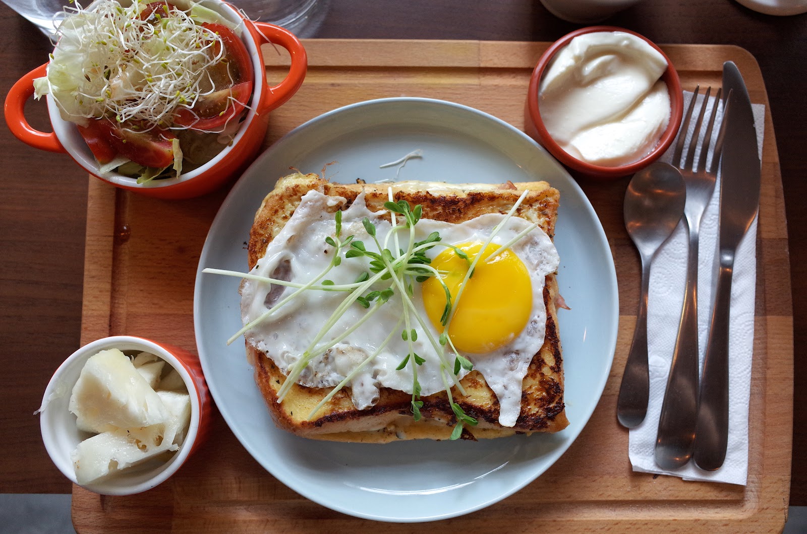 今天我點了一份Pichot招牌吐司早午餐,類似法式吐司與古巴吐司的融合,浸了蛋液去煎的吐司夾著厚實的融化起司,上面配著一顆飽滿的太陽蛋。旁邊附有一碗生菜沙拉,有我小時候很愛的苜蓿芽。還有一碗奶酪,酸酸嫩嫩的有點像豆花的口感。緊接著是今日水果-牛奶鳳梨,實在好甜!